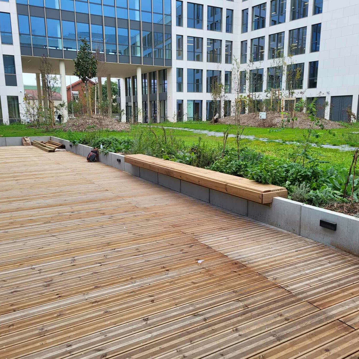 Les travaux paysagers ont été réalisés par le groupe MUGO pour le compte de Bouygues Bâtiment IDF Construction Privée. Démarrés en 2023, ces aménagements s’inscrivent dans une démarche écologique et durable. Au centre du campus se trouve un patio de 1 000 m², véritable poumon du site. Des assises en bois sur une terrasse circulaire s’intègrent en pourtour du patio qui devient un lieu de détente et de convivialité. 4000m² de surface végétalisée sur le campus et plus de 130 arbres ont été planté sur l’ensemble du site.