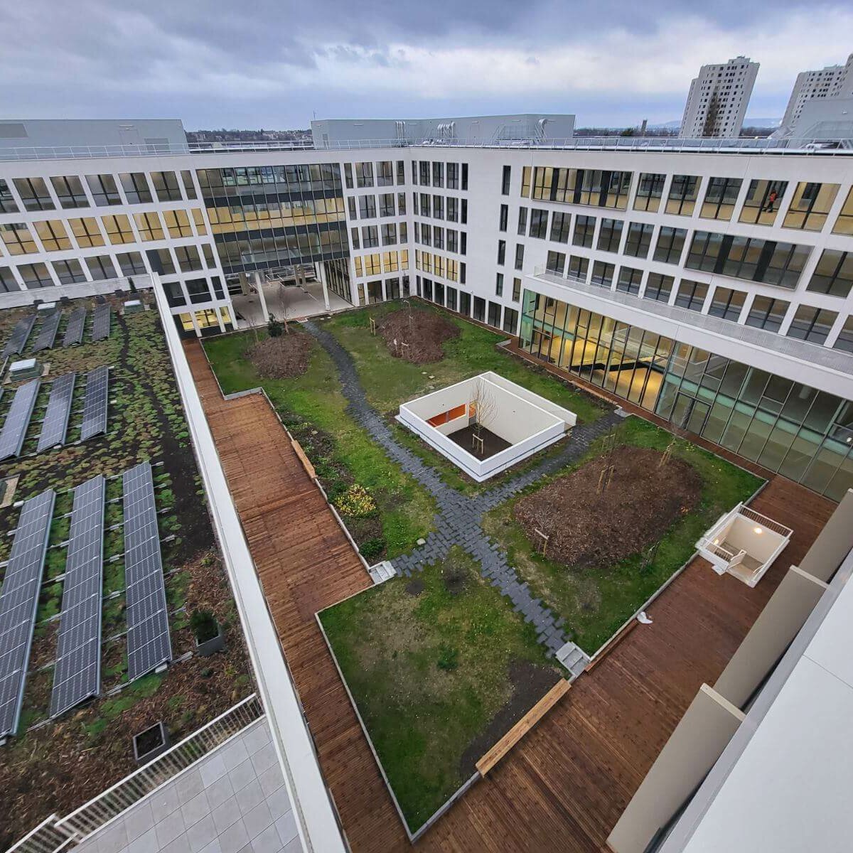 Par la suite, la gestion écologique de ces espaces verts (certification Biodivercity) ainsi que les initiatives en faveur de la biodiversité sont supervisées par nos jardiniers et ingénieurs agronomes, en collaboration avec Humakey. Ces efforts s’inscrivent dans la charte de gestion durable de La Française REM. En parallèle, Chateauform Inside mettra en place une offre complète d’hospitalité (food corner, bibliothèque, espaces de conférence, etc.) sur le campus.