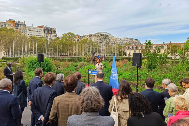 Dessiné par Louis Albert de Broglie d’après la philosophie de Deyrolle, mis en place par MUGO, ce jardin-potager a pour vocation de symboliser le message d’universalité incarné par l’UNESCO autant que les enjeux territoriaux de résilience qui sont au cœur des préoccupations environnementales et sociétales contemporaines.